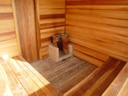 As saunas são aquecidas a lenha ou a eletricidade, e o seu interior é revestido de madeira, e é quase obrigatória a nudez na sauna. O alívio de dores de coluna, a hidratação da pele, a desobstrução dos poros, o aumento da circulação sanguínea são alguns dos benefícios trazidos com a sauna. Além disso a sauna ajuda a combater o strees e a hipertensão.